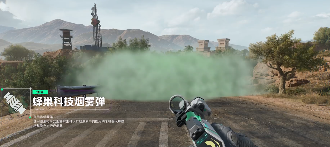 G技能蜂巢科技烟雾弹,又是一个防御技能,对比V技能的烟幕,这个G技能就是烟雾弹的效果。但是要比普通的烟雾弹范围更大,持续时间更久。而且该技能释放后,使用激素枪瞄准烟雾发射可以使烟雾转换成治疗队友的绿色烟幕,队友在其中能够缓慢回血。