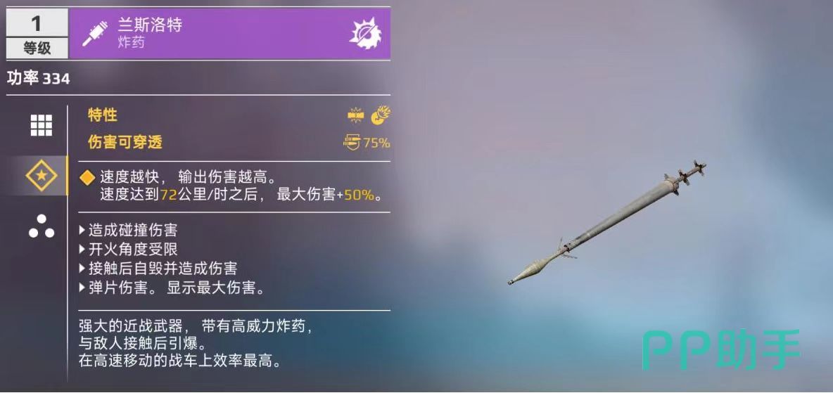 在目前属于爆破长矛类型的武器中,兰斯洛特是比较有代表性的一个,它可以在高速行驶的状态下造成更多伤害,在一般行驶速度下,也能获得不错的伤害加成。兰斯洛特属性为75%伤害可穿透,速度越快输出伤害越高,达到72公里每小时的时候,最大伤害能增加50%。它能造成碰撞伤害,接触后自动毁灭,属于弹片伤害类型,缺点在于开火角度会受限。