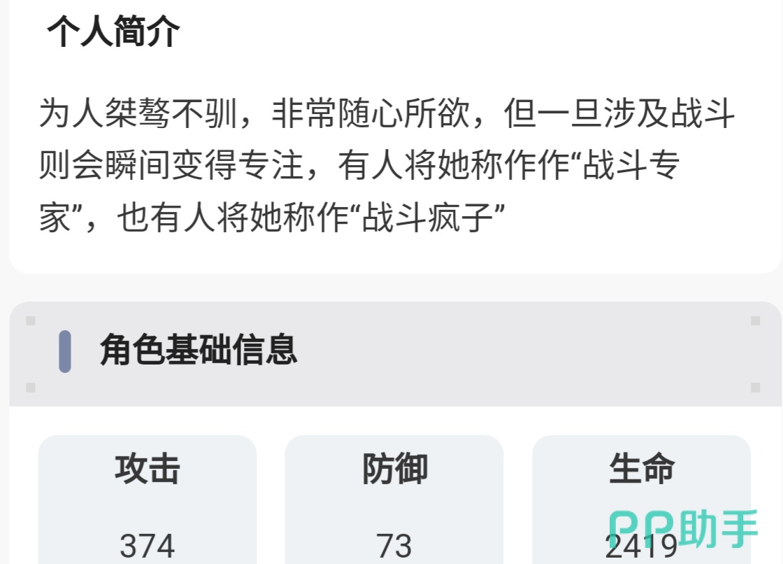 从狄莉丝的属性基础本面来看,格莉丝的攻击力达到了374,这也再一次说了她的攻击力是非常优秀的,与强大的攻击力相比,她的防御力就明显低了很多,仅仅只有73,当然防御力弱这一方面我们也可以接受,毕竟攻击力强的角色很少有高防御的存在,值得注意的是狄莉丝的生命值竟然高达了2419,从这一点来说,狄莉丝的血肯定比较厚的。