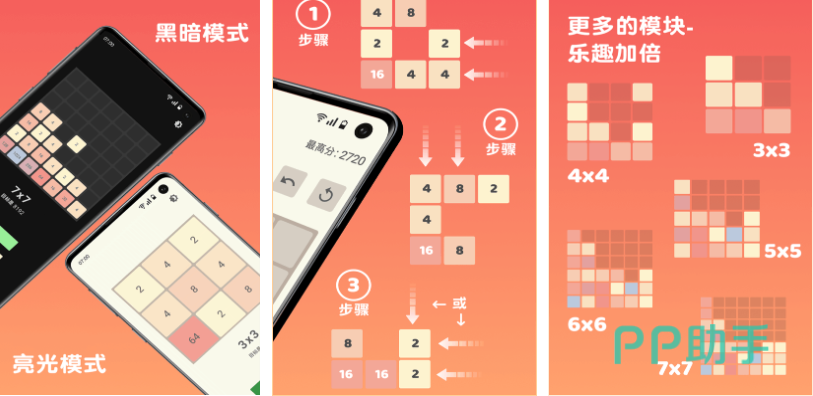 这款极简版本的2048游戏画面风格简单且难度也不高,虽然画面表现并不出众但却具备超强的耐玩性,上下左右滑动屏幕就可以让数字方块向不同位置移动,游戏的运行方式很流畅而且还支持玩家回退步数哦,极高的策略性和容错率都是这款作品的亮点,游戏还具有两种不同的主题背景让画面更有观赏性,5X5、6X6等超多的棋盘期待着大家挑战。