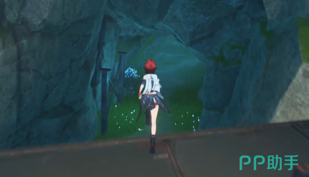 然后就会传送到一个楼梯上,左前方便可以看到一个洞穴,我们直接进入洞穴沿着楼梯往下走,大概走过五阶楼梯之后就是大家想要找的地下入口了,这里楼梯也消失了,我们直接跳下去继续一直往前走就好。