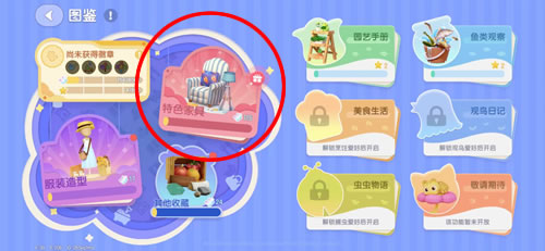 在图鉴中左侧按照大类型做了不同种类的划分,目前是三大类,分别为家具、服装和其他。右侧则是一些其他类型的分类,包含园艺手册、鱼类观察、美食生活、观鸟日记、虫虫物语等。分别对应了种植、钓鱼、烹饪、鸟类识别、捕虫等玩法解锁出来的图鉴。