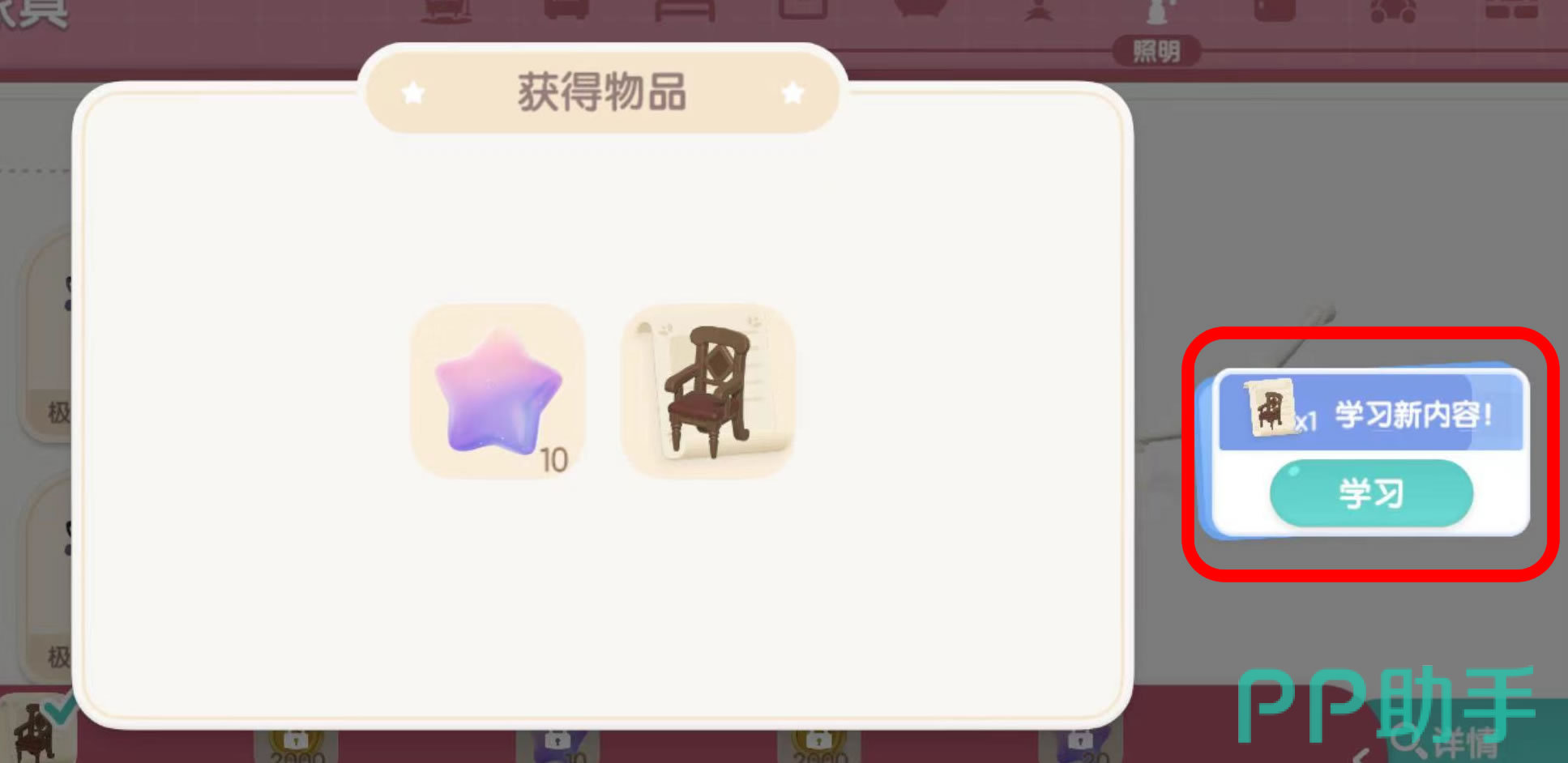 点击左侧特色家具栏目,最上方是细分出来的各种家具类别,比如套装、沙发座椅、床等等;中间是子分类中的详细内容;下方则是完成图鉴一定数量所能解锁的奖励。此时正好第二个奖励获得了一个“扶手椅”的制作图纸,点击即可领取。