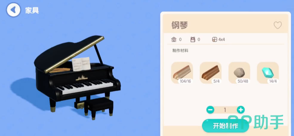 通过任务的不断进行,工作台解锁了钢琴制作方案,此时就可以自己造一架钢琴了。