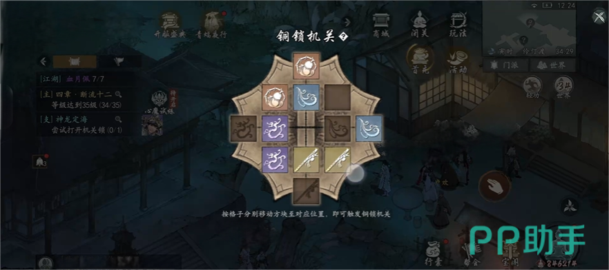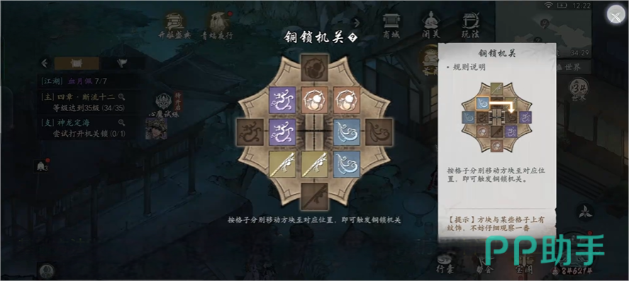 玩家在跟随着支线任务“神龙定海”不断推动剧情时,会面临着铜锁机关这一难题。通过观察玩家会发现,方块下的部分格子有着与方块相同的图案,玩家只需通过移动,将其移动到指定位置,便可以解开这一机关。