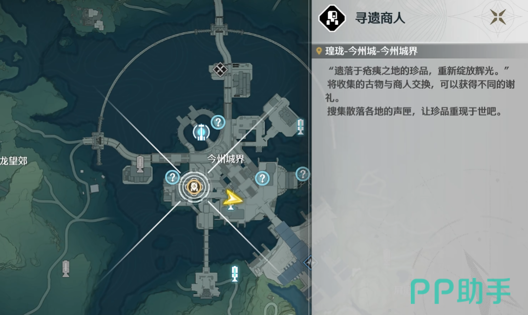首先我们需要去找到寻遗商人,寻遗商人的位置在下图所示位置,这位商人专注于收集不同的古物声匣,大家下次有搜集到古物也可以来这里与他交换,可以获得不同的谢礼。