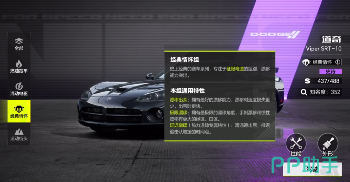 经典情怀车组是许多朋友的青春,代表车辆有保时捷911和AE86,这个组的车辆极速性能和加速性能和上面两组相比会比较弱,但是它的优势就是在漂移的时候能够损失更少的速度,并且在弯道漂移的时候会拥有更大面积的绿区和白区,这样当面对U型弯的时候这个组别也能做到轻而易举的应对,在跑多个急弯的地图时可以选择使用经典情怀组。