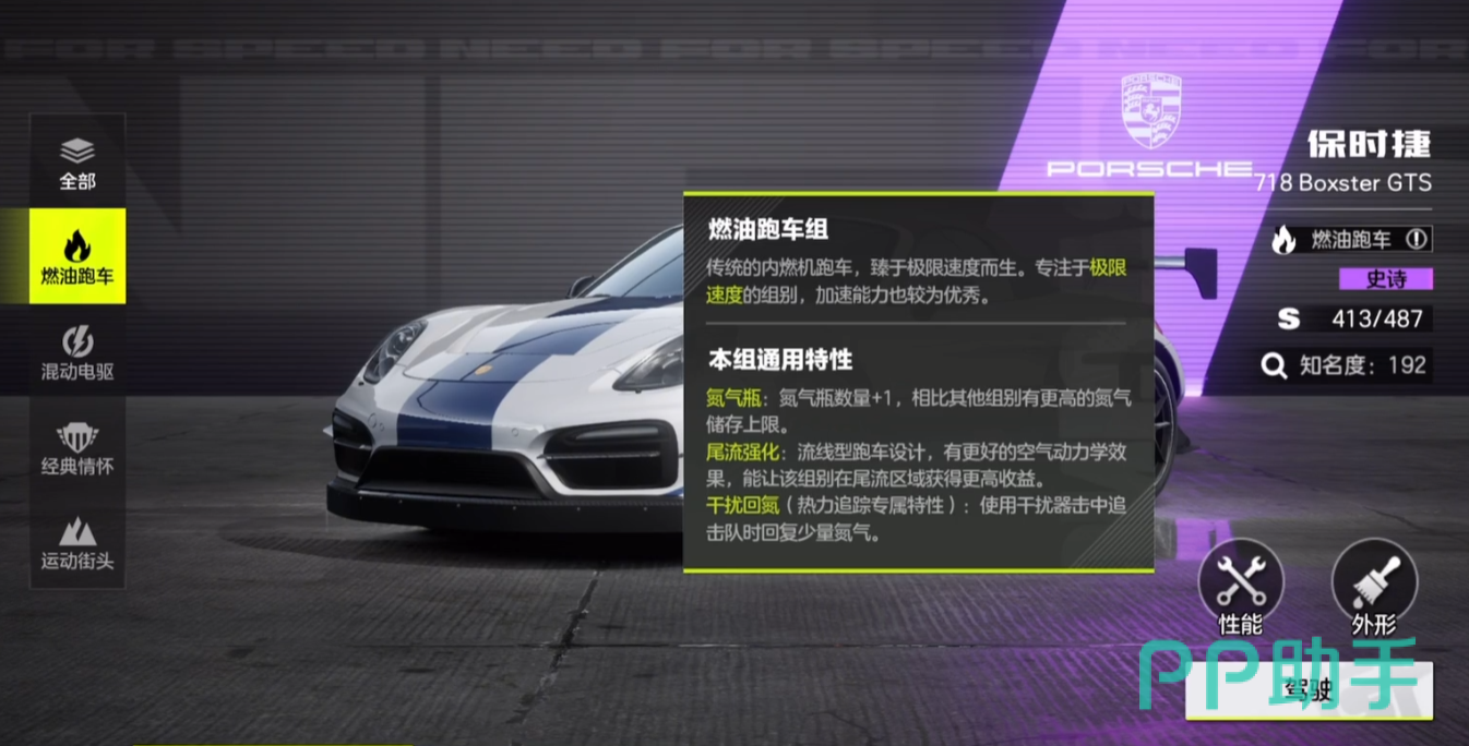 接下来介绍的是燃油跑车组,这一组的代表领跑车是玛莎拉蒂MC20和兰博基尼小牛,这个组的车很多都是后驱车,动力更加强劲,拐弯也更迅速,和电驱组相比该组的极限速度更出众,在比赛中会比其它组赛车多一次氮气存储,并且这个组的车在吃尾流以后获得的速度更快,还能回复很多氮气,拥有极强的后追能力,在热力追踪模式里如果用干扰器击中了对手会回复氮气,在可以油门全开的地图中这一组别的表现会更加优异。