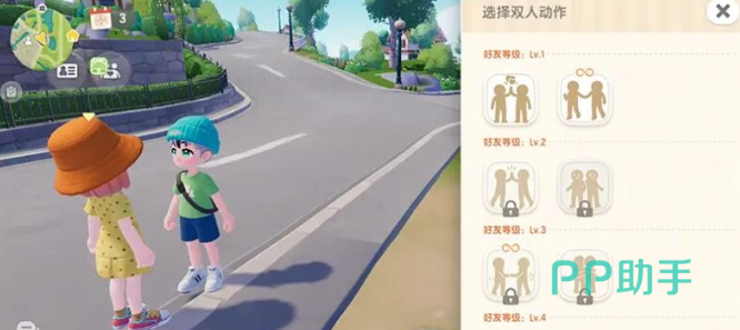 想要提升等级是有好两种方法的,第一个方法是进行双人动作,玩家可以先进入心动小镇中,找到自己的好友并和他靠近后,点击好友的友谊图标,就能弹出来互动的选项,然后弹出来的互动当中,选择一个已经解锁的动作进行互动。