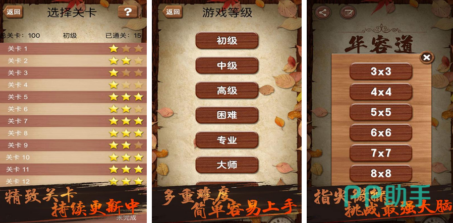 除了经典的木板华容道之外,玩家还可以在数字华容道中移动各个数字从而正确排列。在木板背景中,木块数量不限。既可以是三个这种比较简单的移动玩法,玩家也可以挑战高难度的八个木块。在具体操作上,玩家随意从一个格子开始移动即可,最后组成的顺序为正常顺序即可进入下一关。