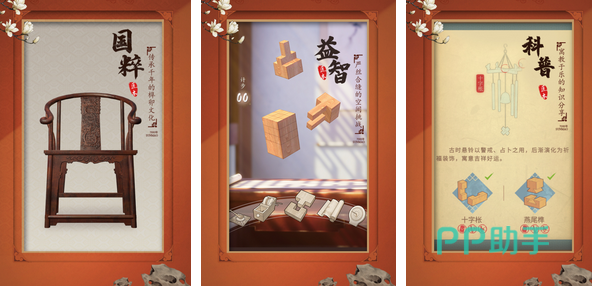 榫卯关卡众多,玩家利用此结构将各种积木组成目标形状物体。在修行板块,玩家可随意进行闯关。在馆藏板块,玩家可以感受到其他由此结构组成的藏品。功能齐全,玩家可以隐藏已经规划好的木块,也可以通过划线的方式寻找下一个需要补充的木块,必要时候还可以进行撤销操作。
