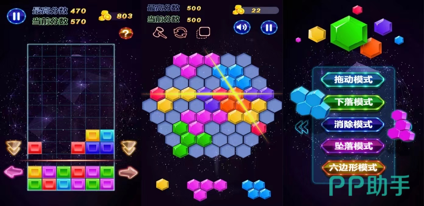 《六边形消消乐》这个游戏是非常有创意的,在游戏中玩家需要进行不断的淘汰赛,进入到游戏之后会随机的出现三个不同形状的方格,在游戏中的俄罗斯方块可以随意的进行移动,玩家需要把随机出现的俄罗斯方块儿放到每个关卡里,把一排或者是一行中的所有方格填满才可以消除掉。游戏里面的关卡设置了非常多的模式,在游戏中玩家的分数会进行积累。