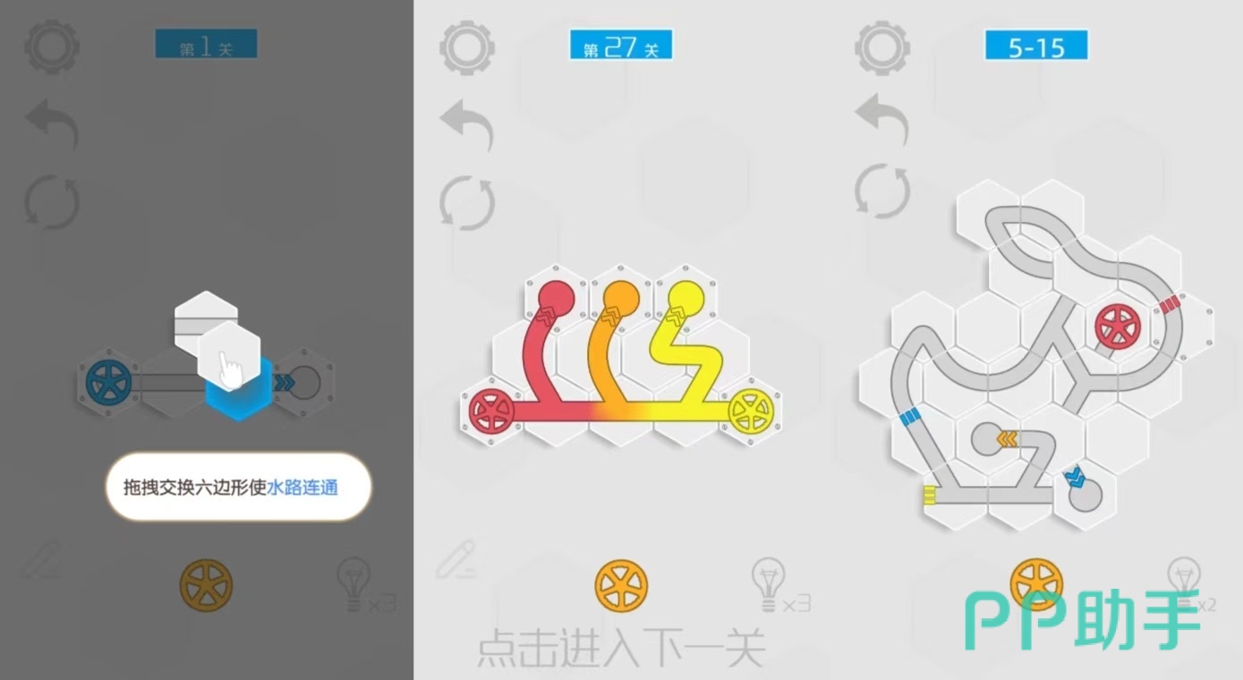 《六边形接水管》每一个关卡中都有不同的场景,玩家需要把场景中的水管顺利的拼接在一起,让水管中的水顺利的流出来。在每一个场景中都会出现不同的六边形方块,玩家可以去移动游戏中的方块,关卡里面设置的也是难易程度大有不同,当玩家遇到困难关卡的时候可以选择使用提升,在游戏中场景都是简约的白色背景。
