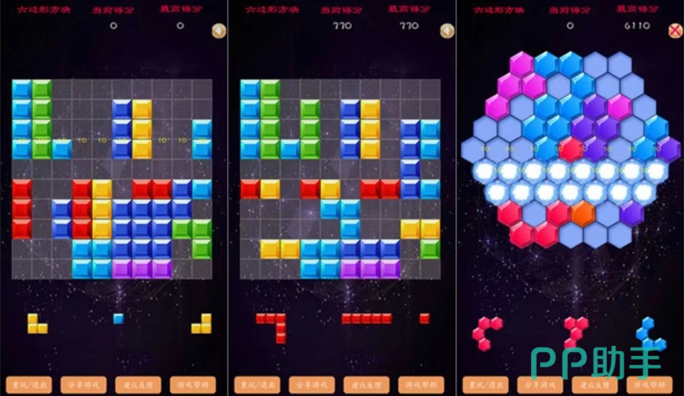 《六边形百变方块》把方块作为主要的题材打造了一个消除游戏,提供了非常多百变的关卡可以去挑战,游戏里面一共打造了两个模式,两个模式中有不一样的规则和玩法。游戏里面的俄罗斯方块有着非常多不同的形状,玩家需要将随机出现的方块进行排列组合,玩家玩家需要把游戏中的方块进行消除。在游戏中的关卡难度会逐渐的增加。
