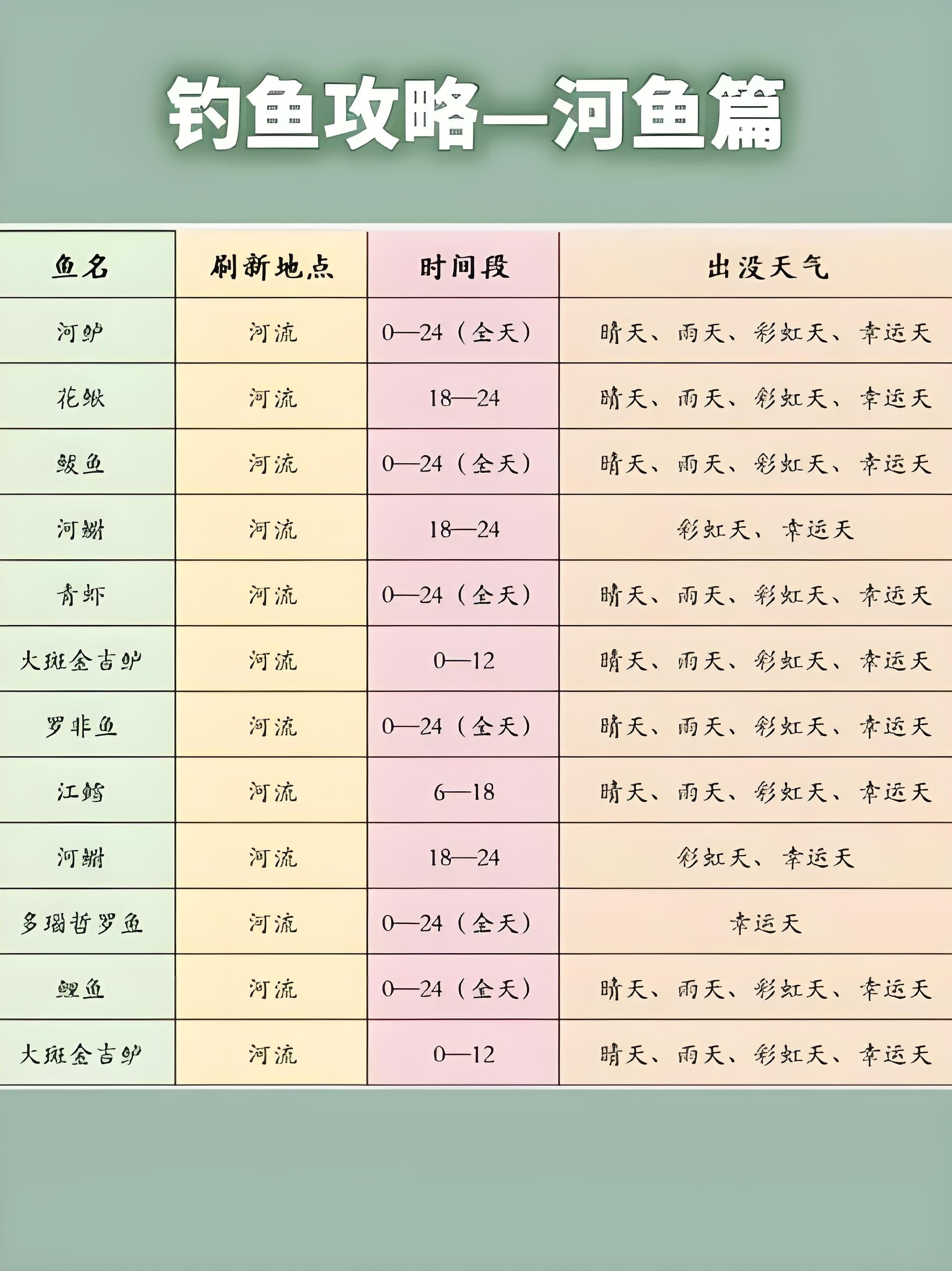 不同的天气中出现的鱼类品种也是不一样的,比如说鲈鱼、罗非鱼、鲅鱼、鲤鱼、青虾、和泥鳅都非常喜欢晴朗的天气、有雨的天气或者是雨后出现彩虹的天气。