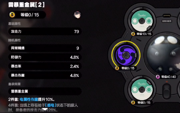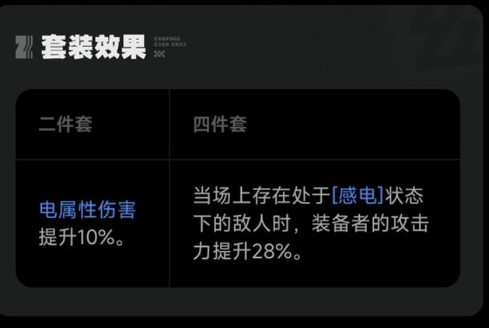 雷暴重金属这个驱动盘在游戏里起到的作用是能带来电属性伤害的,如果在游戏里使用两件套的话,那么就能提升角色的电属性伤害能力10%,如果是有四件套的话,可以让角色的整体攻击能力能提升28%。因为这种独特的特性,所以玩家可以把驱动盘装配到电属性的角色上。