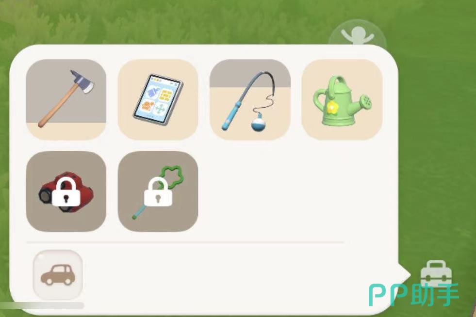 右下角的工具箱中放置着经常使用的各种工具。比如斧镐可以用来采集石块、木材,平板用来设计装修和室内布置;钓竿可以钓鱼、喷壶可以浇花种植。另外最下方还可以召唤出座驾,从最开始的电动小摩托到小汽车等等。