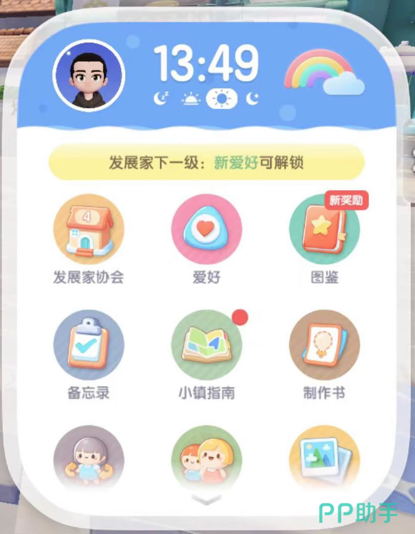 2、在智能电子手表中,会获得现实真实的时间。下方是各种信息的收藏区,其中发展家协会的等级是决定了功能开启和可购道具种类的;爱好则收集了各种园艺、钓鱼等玩法的熟练度和等级;图鉴中对玩家每在游戏中解锁的新物品进行记录;后面各种信息比如服装、友情手账、相册、邮箱等也是用于信息管理的。