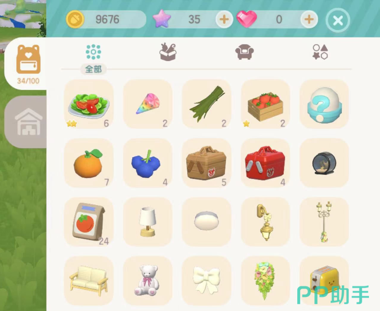 3、除了信息知识,更多要接触的是背包面板。这里存放着所有玩家获得的道具内容,分为道具、家园、杂物三类;另外背包最大容量只有100格,超过的部分可以存放到仓库中。