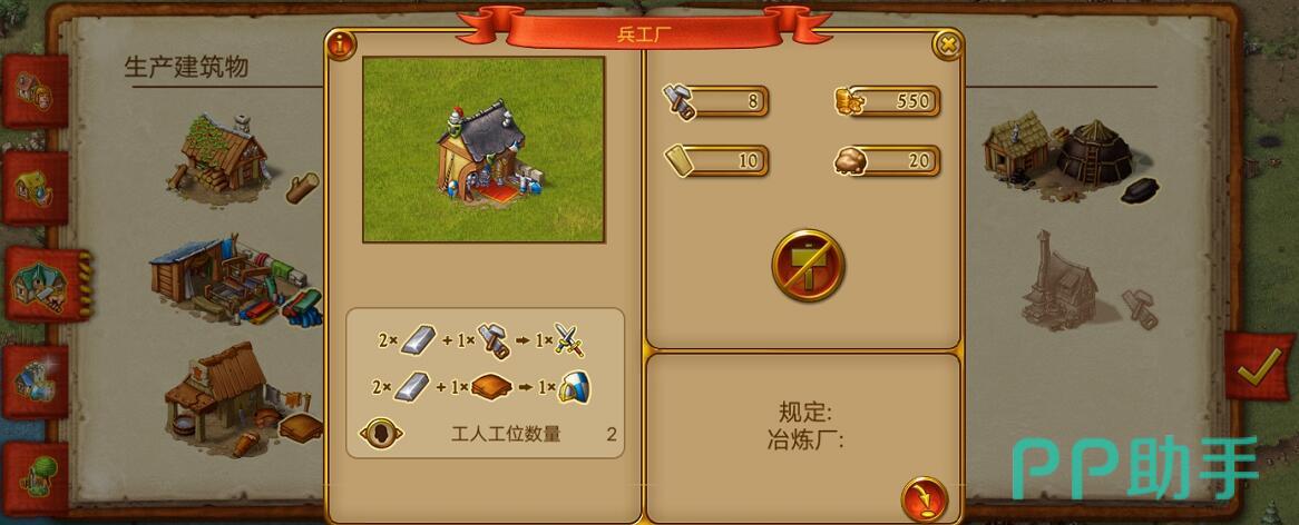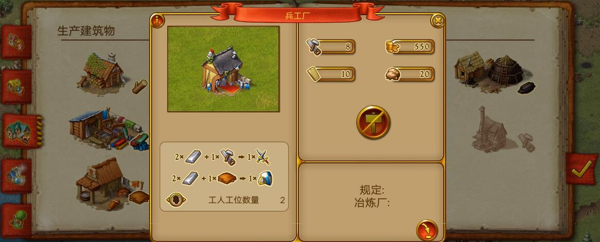 建造了兵营后,为了给士兵们打造武器,需要建造兵工厂。兵工厂制造出来的武器可以提高士兵的攻击能力,而护甲可以提高防御的能力。