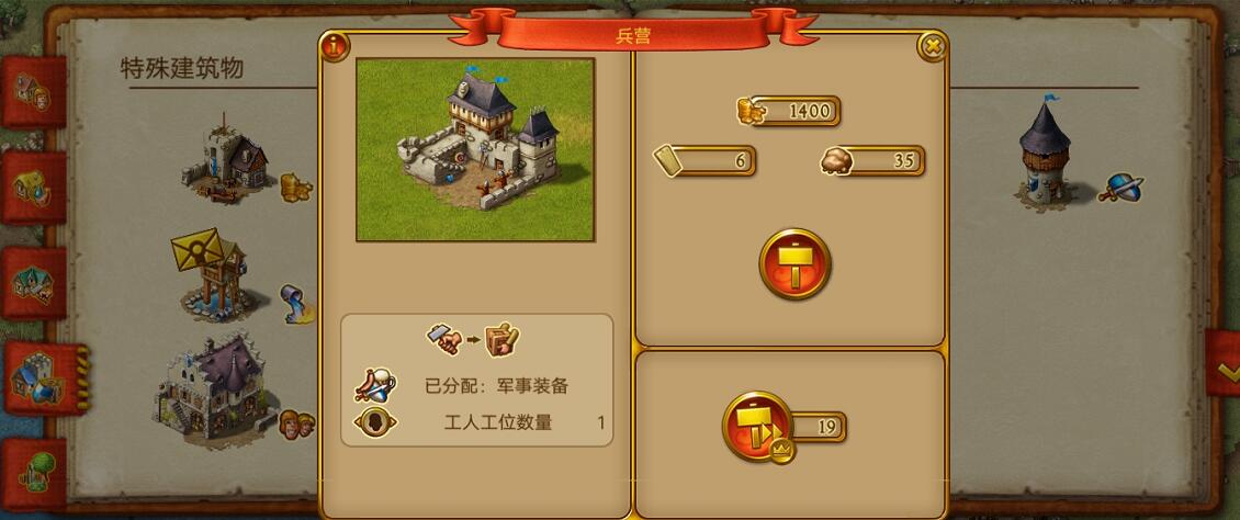 家园7中军事类的建筑有两种,一种叫做兵营,这是统治者的王国中开启军事力量的基础建筑,没有军营就无法进行招兵或者建造兵工厂和守卫塔等建筑。兵营作为基础建筑,需要花费一千四百个金币和六个木板,三十五个铜矿来建造。造价不便宜但是是必须建造的建筑,不然后面被强盗抢劫损失更多。