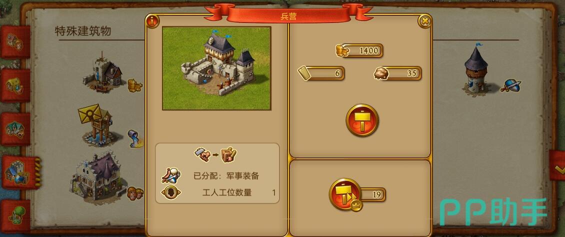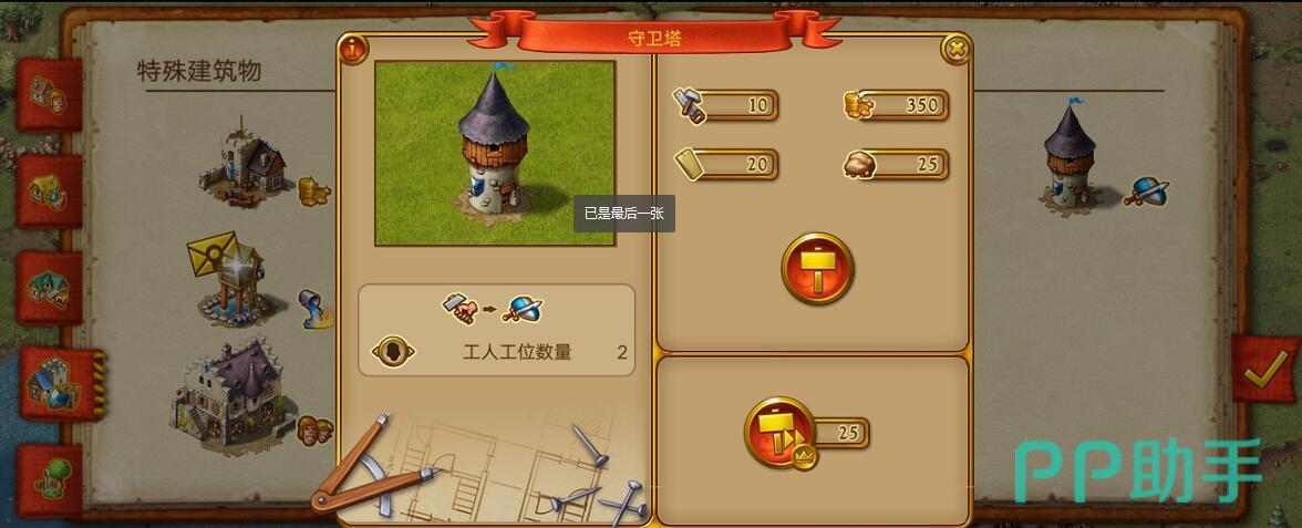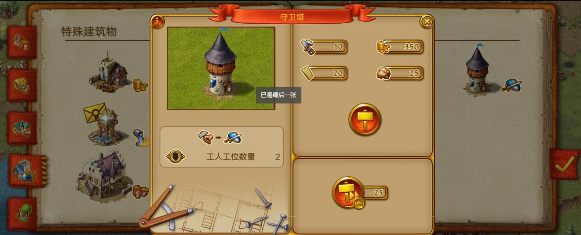 需要注意,建造装备需要皮革所以玩家最好也建一个皮革小屋来保证皮革的数量。有了这些基础军事物资后就可以建造守卫塔了。兵营并不会直接输出士兵去城镇的各个地方保卫居民,但是守卫塔就是起这个作用的。