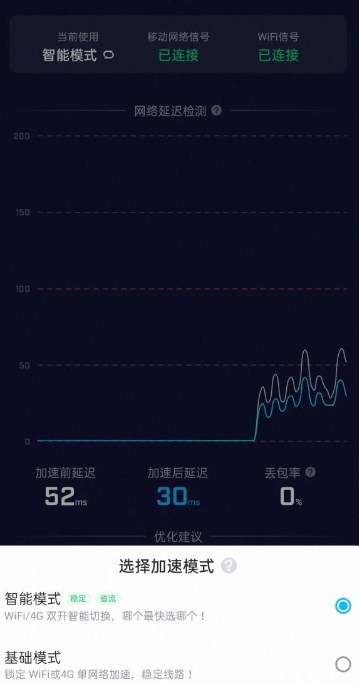 同时,为了彻底解决延迟和卡顿的问题,可以在设置中打开WIFI/4G智能切换模式,这样biubiu加速器就可以根据网络的延迟自动切换到最合适的网络,最大限度的保证了游戏加速体验。