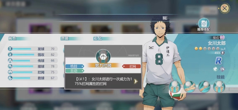 女川太郎的终极技能努力拦网是一个主动技能,当他使用时,将进行一次威力高达175%拦网属性的拦网。这种拦网不仅威力巨大,而且成功率极高,能够直接阻断对手的进攻,甚至直接得分。这使得女川太郎在关键时刻成为球队的防守核心,他能够在对方强力进攻时挺身而出,保护球队不受侵害。