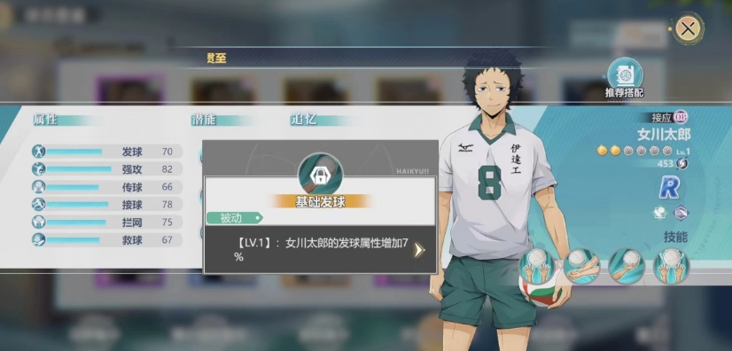 女川太郎的第二个被动技能基础接球同样提升了他7%的接球属性,这让他在接球方面更加稳定,能够准确地接住对方的发球和扣球,并迅速转换为进攻状态,为球队赢得主动权,而他第三个被动技能基础发球也不容忽视,它增加了他7%的发球属性,使女川太郎的发球更加强劲,速度快且弧线难以捉摸,有效地破坏对手的传球,为球队创造更多的可能性。