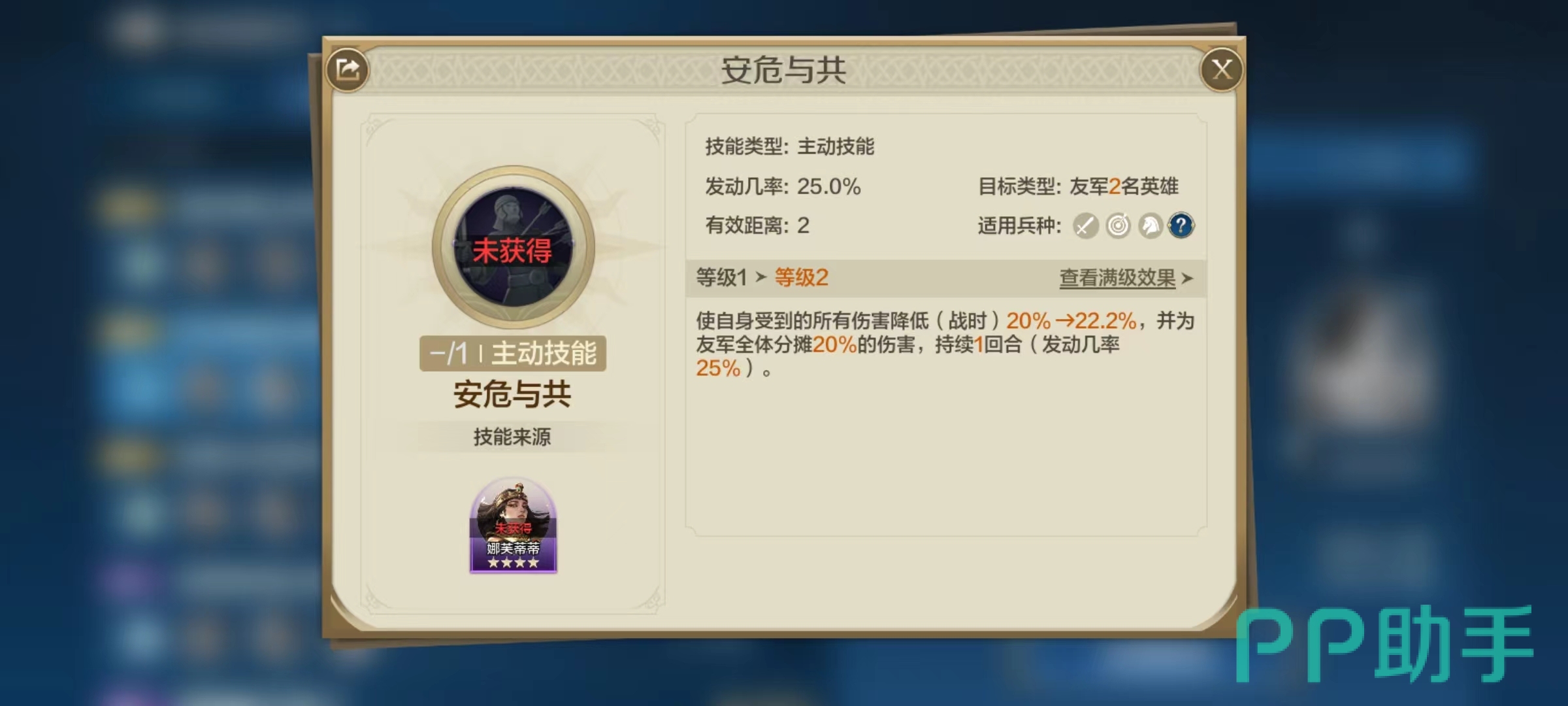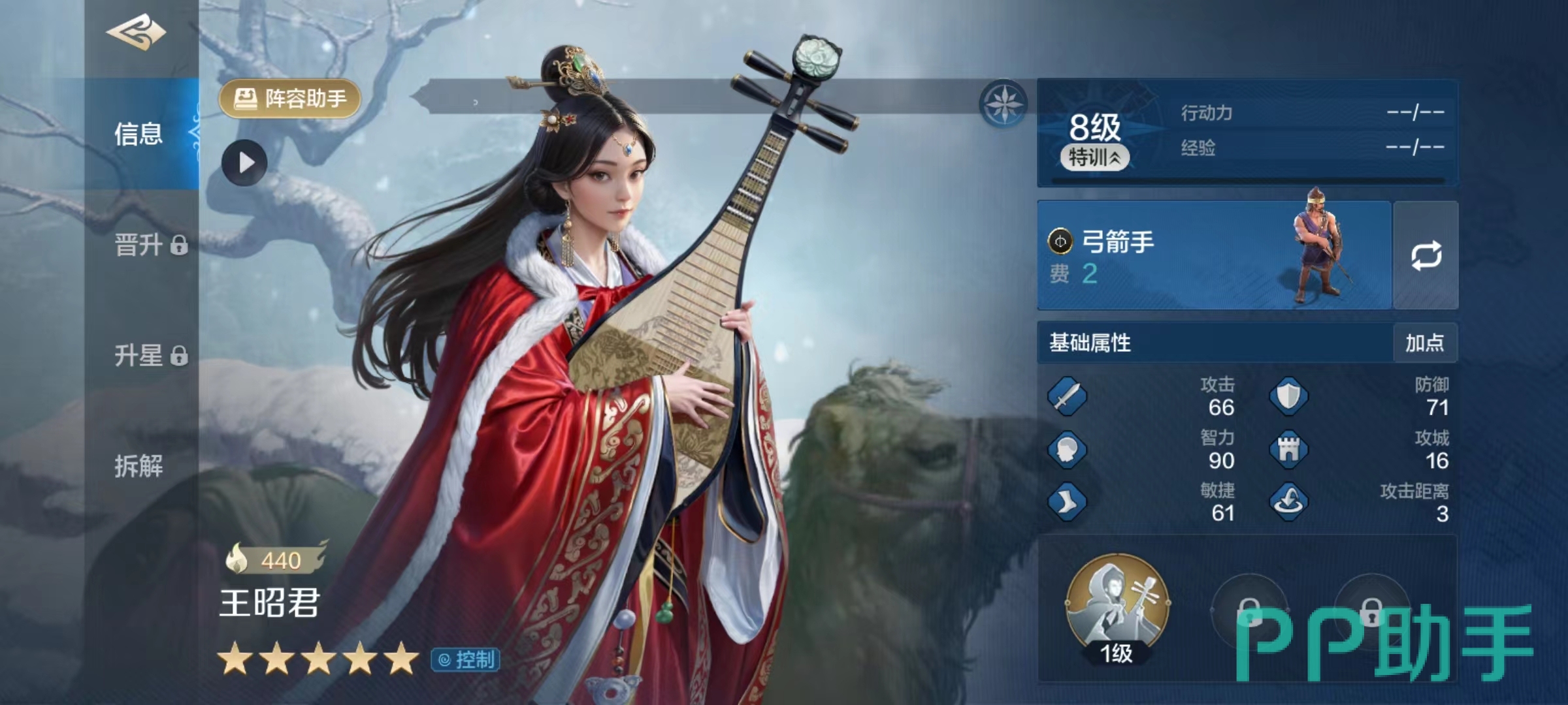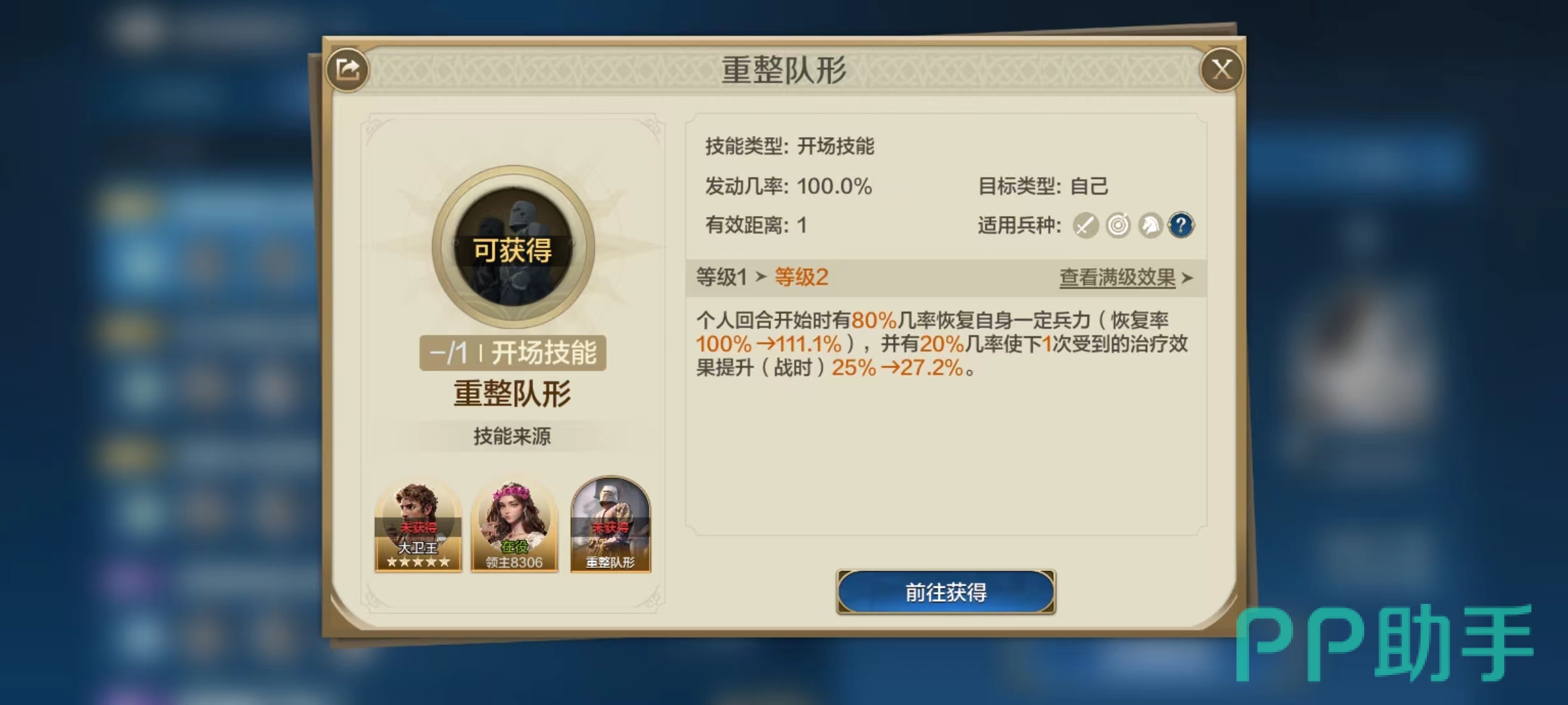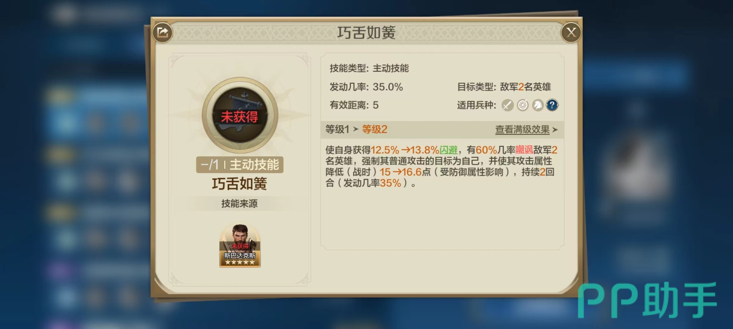 首先来看一下重整队形,它属于开场技能类型,在个人会和开始的时候有几率恢复自身兵力,达到满级时恢复率为200%,80%几率触发,并有20%几率使下一次受到的治疗效果提升。因为王昭君要选择女性玩家作为搭配,其中肯定会出现很多治疗型辅助,有了这一技能,生存能力就能得到大大加强。巧舌如簧属于主动技能类型,它能够使自身获得25%闪避,有60%几率嘲讽敌方两名英雄强制对方攻击自身,并使其攻击属性降低,受防御属性影响,持续两个回合。