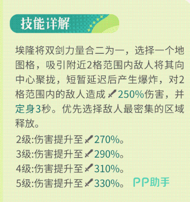冰风龙卷:埃隆将双剑的力量汇聚,集中火力于指定区域,迅速牵引周围两格内的敌人至中心,并在短暂延迟后制造一次爆炸,对目标区域内的敌军造成250%的攻击伤害并使其瘫痪3秒。此技能倾向于在敌方单位最密集的部分发动。这种战术能够有效地控制并削弱敌人的战斗力,为战斗带来可能的转折点。