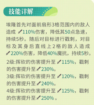 冰斩风刺:埃隆首先向前方扇形区域的敌军释放魔法,造成相当于其攻击力110%的伤害,并立即减少他们的急速值50点,此效果持续5秒。随后,他对选定的敌人及其背后直线范围内的敌人进行精准戳刺,造成220%的伤害,并在之后的5秒内降低他们的魔法抗性40%。