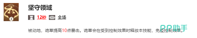 觉醒之力:是诡草的觉醒技能,能够提升坚守领域的效果。在觉醒后,坚守领域的冷却时间会降低,让诡草能够更频繁地释放这个技能,增强她的生存能力。这个技能在后期团战中非常有用,能够确保诡草在关键时刻能够保持足够的生存能力。