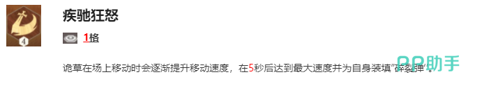 疾驰狂怒:是诡草的移动技能,能够提升她的移动速度并装填“碎裂弹”。在战斗中,诡草会随着时间的推移逐渐提升移动速度,并在达到最大速度时为自身装填“碎裂弹”。这个技能让诡草在战场上更加灵活,能够快速穿梭于敌人之间,对敌人造成致命的打击。