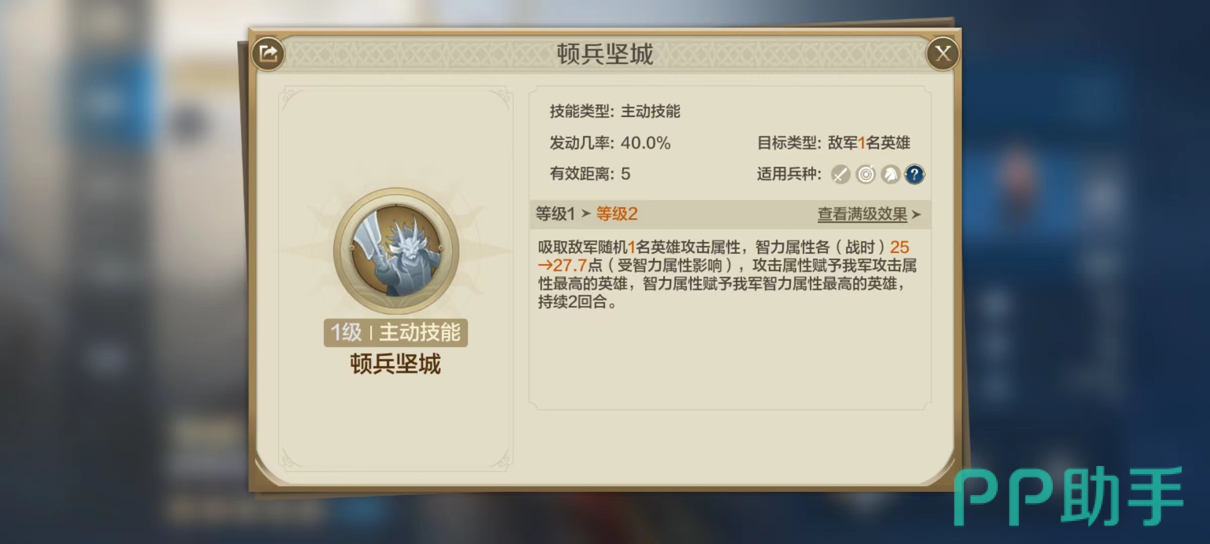 武田信玄的自带技能为主动类型,满级时有40%发动几率,吸取随机一名敌方英雄的攻击属性和智力属性,最多50点。攻击属性赋予我方攻击属性最高的英雄,智力属性赋予我方智力属性最高的英雄,持续两个回合。如果他吸收的属性加强到自己身上,那么就成为了很出色的输出,可惜给予了队友,就只能成为辅助。使用的时候也要以辅助定位去寻找搭配,技能选择也是如此。
