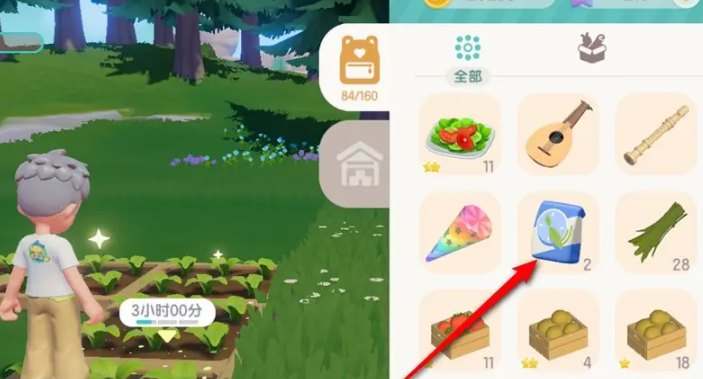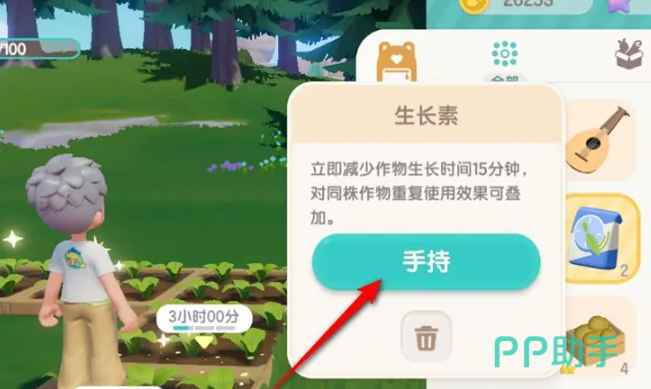 进入到游戏的阶段,只需要把背包打开就可以看到在背包界面的生长素,接下来的操作就很简单,玩家只需要点击“手持”,然后去选择需要生长素的那些地方。