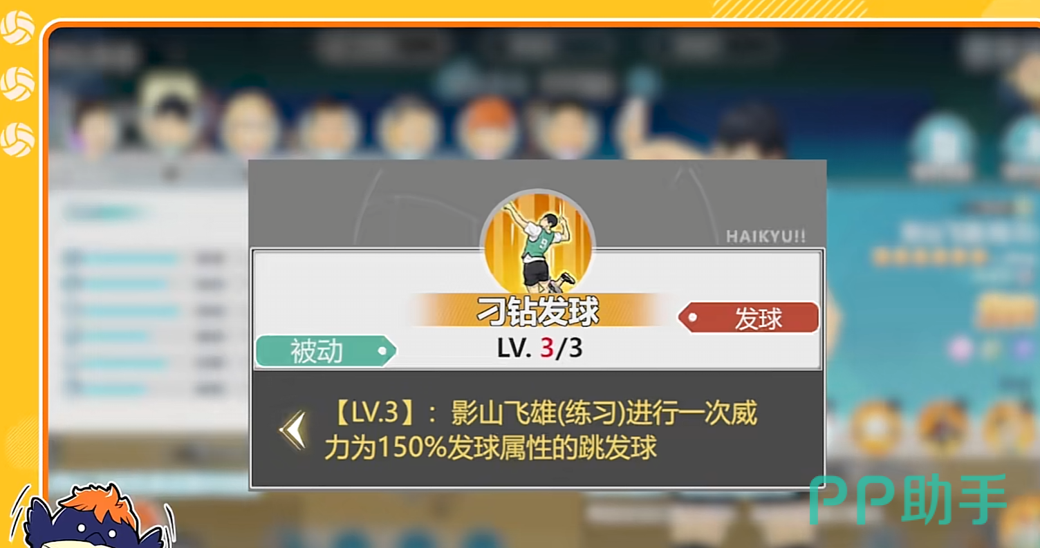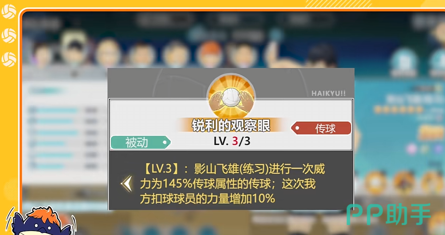 二技能锐利的观察眼属于被动技能,影山飞雄再进行一次威力为145的传球属性传球,这次我方球员扣球的力量增加10%,这个是属于征服队友以及让自己手感更好的一个技能。