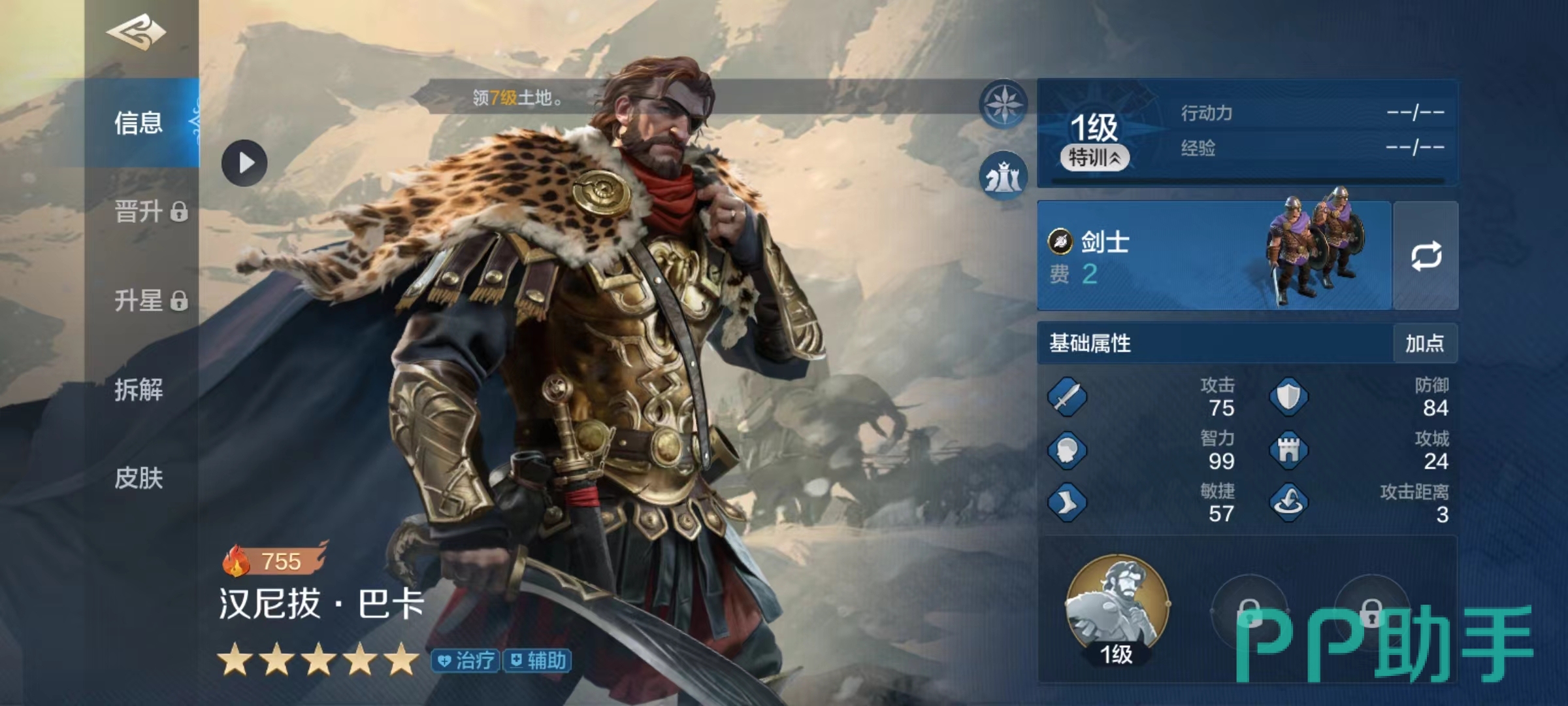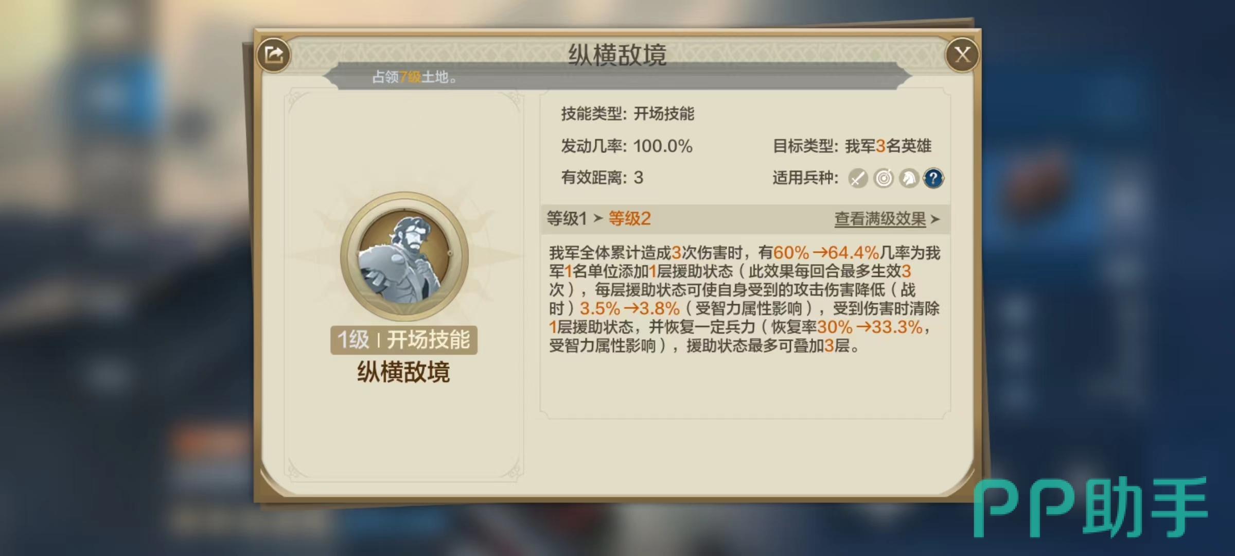 汉尼拔巴卡是属于治疗型的辅助,这一点和自身粗犷外形有些名不符实,它在属性方面智力比较高,自带的是开场技能纵横敌境。该技能达到满级时,我军全体累计造成三次伤害时,就有100%几率为我方一名单位增加一层援助状态,每层状态可以降低自身受到的7%攻击伤害。受到伤害时将清除一层援助状态并恢复兵力,援助状态最多可以叠加到三层,兵力恢复和智力属性相关。如果阵容中的武将可以频繁打出伤害,那么汉尼拔巴卡的技能就可以频繁触发,这是搭配时的要点。