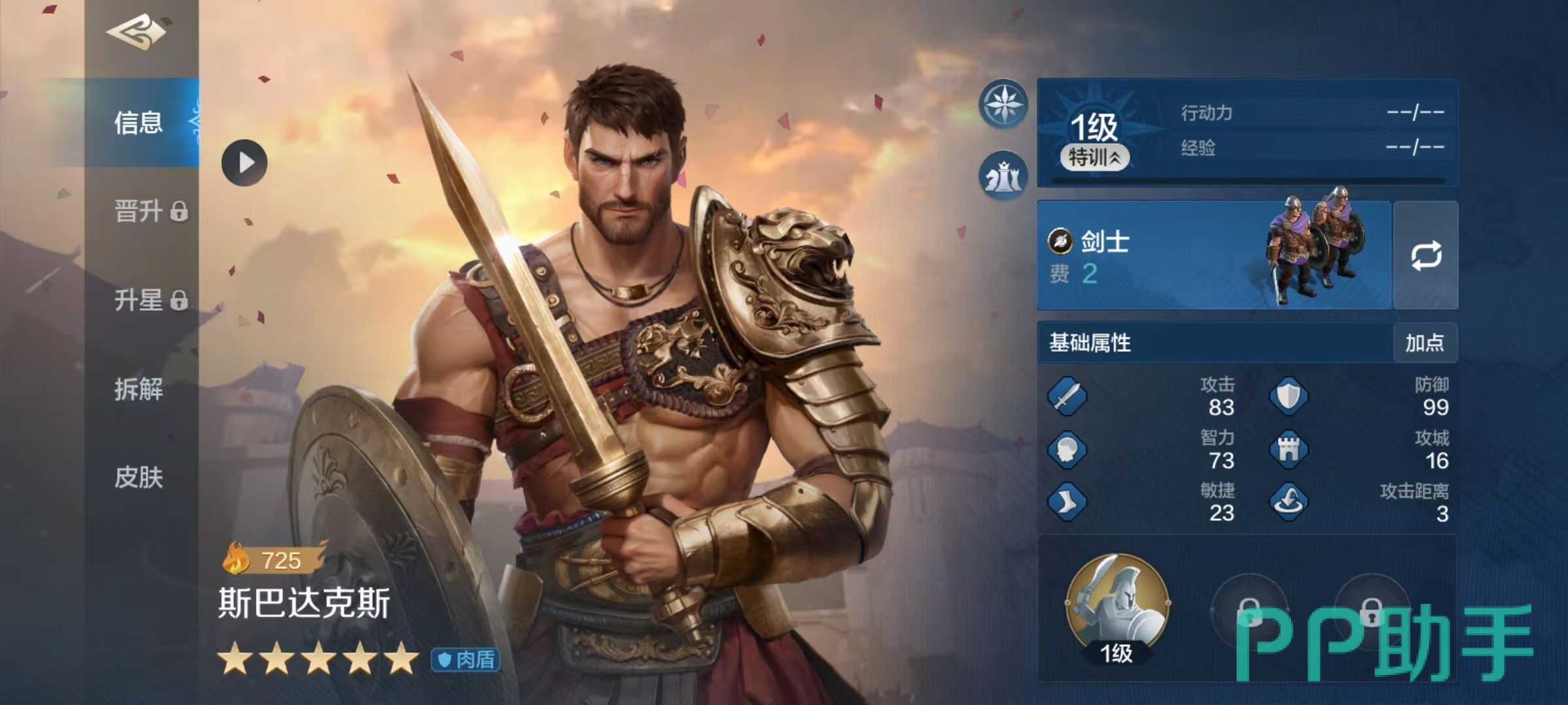 斯巴达克斯是重装战士,属于肉盾类型,它所携带的被动技能每回合都有40%几率保护全体友军,为友军来抵挡普通攻击。同时每回合行动时能提升自身智力、防御和攻击三项属性,每次受到伤害时有几率进行这三项属性的提升叠加。有斯巴达克斯在场上存活,另外两名队友的生存就有保障。