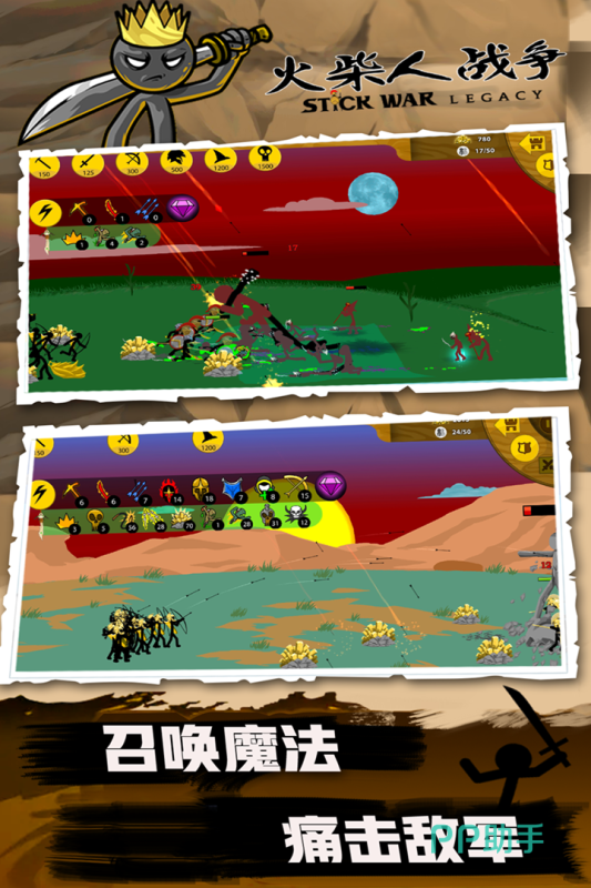 这是一款十分有策略性的火柴人游戏,在这款游戏中,我们将在基地研究各种火柴热的科技,培养自己的火柴人大军抵御敌人的进攻。这片大陆不止我们一个国家,周围分布着无数国家,都在各自研究着的高级技术,都想要一统天下。游戏中的研究项目非常多,有很多种兵种,骑兵、炮兵、步兵都扮演着不同的战争位置,我们还要注意兵种的技能属性选择,适配出最强的王国军。
