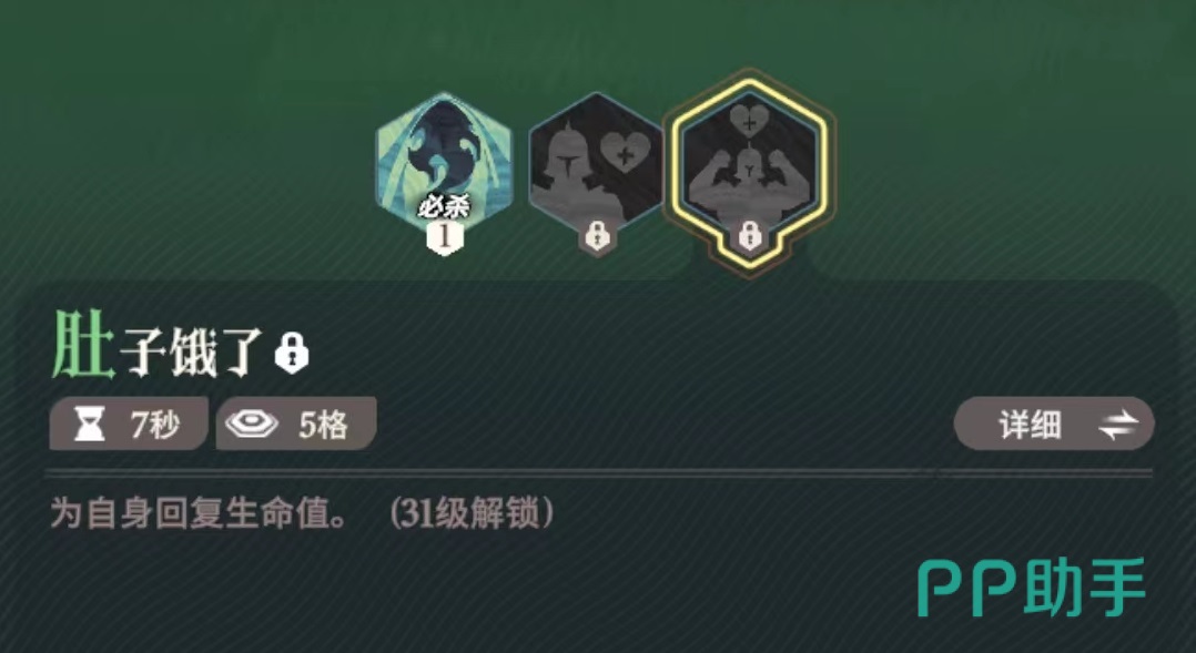 最后一个是肚子饿了,有7秒的冷却时间,施法距离5格。为自身恢复生命值,只有当生命值比例低于70%的时的时候才能释放,该技能满级时回复的血量为攻击力的250%。大家在前期使用主要是利用它的回血效果,这样能起到治疗的目的。