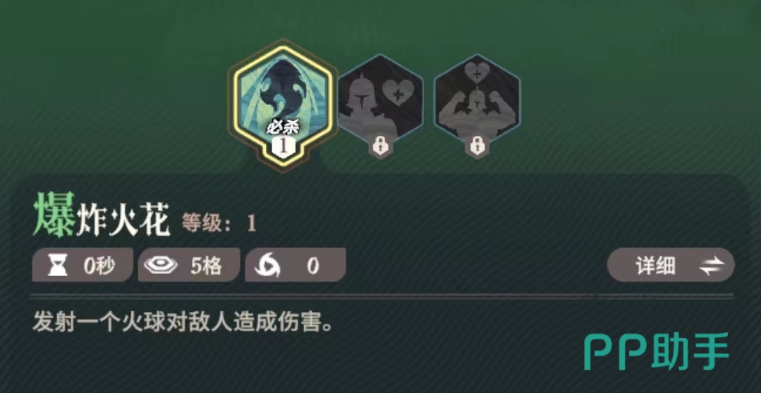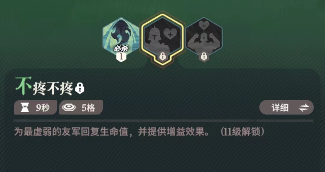 第2个技能不疼不疼,有9秒钟的冷却时间,伤害距离为5格。选择一个最虚弱的友军恢复生命值,并提升该目标10%的攻击力,持续5秒钟。回复的数值达到满级时为攻击力的190%。