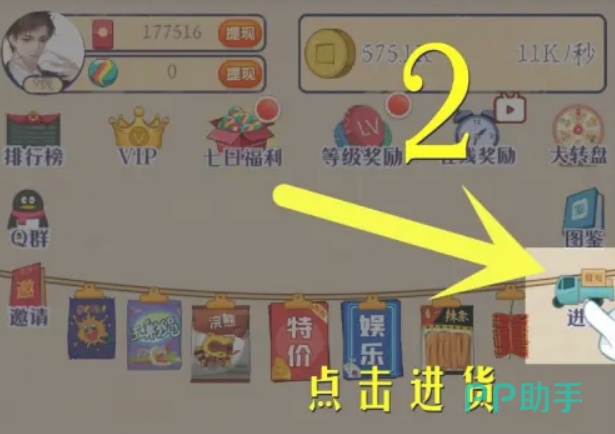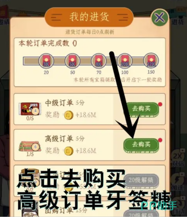 然而,不是所有的商品都能直接在进货界面中找到。如果你寻找的商品不在列表上,比如某些特定的糖果或小吃,你可能需要通过更高级的订单来购买。这时,点击右上角的“进货小货车”图标,并选择“高级订单”,在这里你可能会找到你想要的商品。