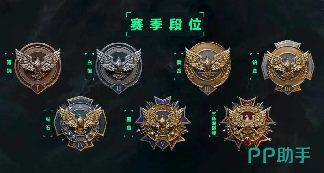 另外就是参与排位是有奖励的,可以在“天梯排名”当中查看“个人排位记录”,就能领到对应赛季的奖励了。目前的三级大概有七个大的段位,从最低的青铜开始,依次是白银,黄金,铂金,钻石,黑鹰,三角洲巅峰这七个,只有达到一个全新段位的时候,才能领到对应段位的赛季奖励。