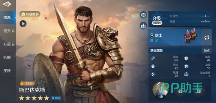 斯巴达克斯,前锋,非常给力的低费前排,自带技能“不屈斗士”每回合都有几率保护己方全体队友为其格挡普攻,同时提升自身的攻防和智力;每次受到伤害也有几率随机提升攻击防御智力中的一项属性,最多叠12层,所以斯巴达克斯是属于那种越战越强的角色,比较可惜的是增加的属性比较随机。