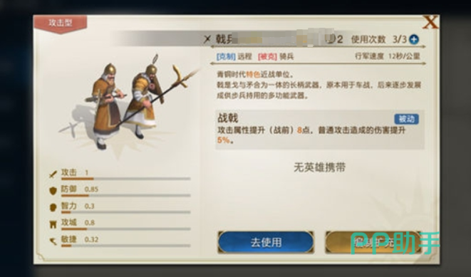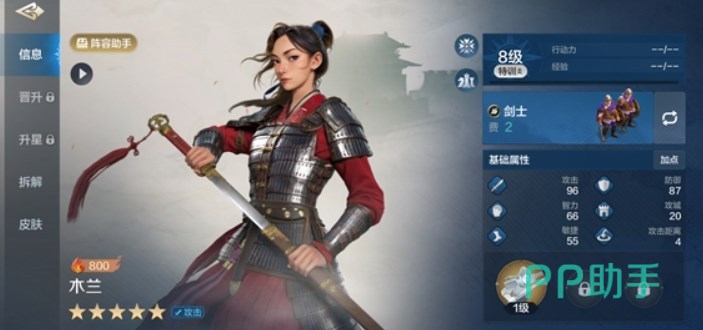 统率位置用木兰,她有着4点攻击距离,高达96点的攻击属性,防御属性也有87点,这已经堪比一些肉盾英雄了。虽然没有哪一项是特别拔尖的,但在综合攻防速度属性是很均衡的。木兰可以携带近战兵种,像是青铜时期的长戟兵,可以加攻击属性,或者是毕业的火绳枪兵。头衔方面专属的巾帼将军赋予自身额外的输出加成,在面对比自己攻击高的敌人时候有造成额外伤害的概率提升,小头衔“战士”和“荣誉”还可以加暴击加攻击。