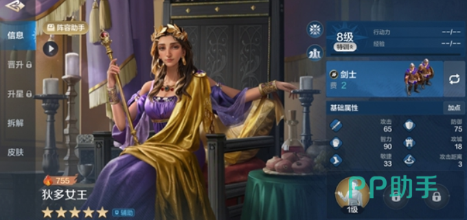 狄多女王,中军位,强力的增益辅和减益辅。自带技能“建城者”的效果比较独特,敌人全体每个英雄造成6次伤害的时候会降低其主动技能伤害,持续2个回合,可以限制敌人的爆发输出。同时该技能还会在每回合自身行动的时候,恢复己方1-2个英雄一定的兵力,恢复量与女王的智力挂钩。