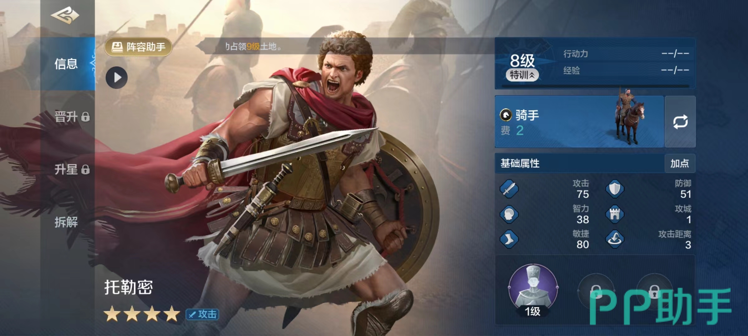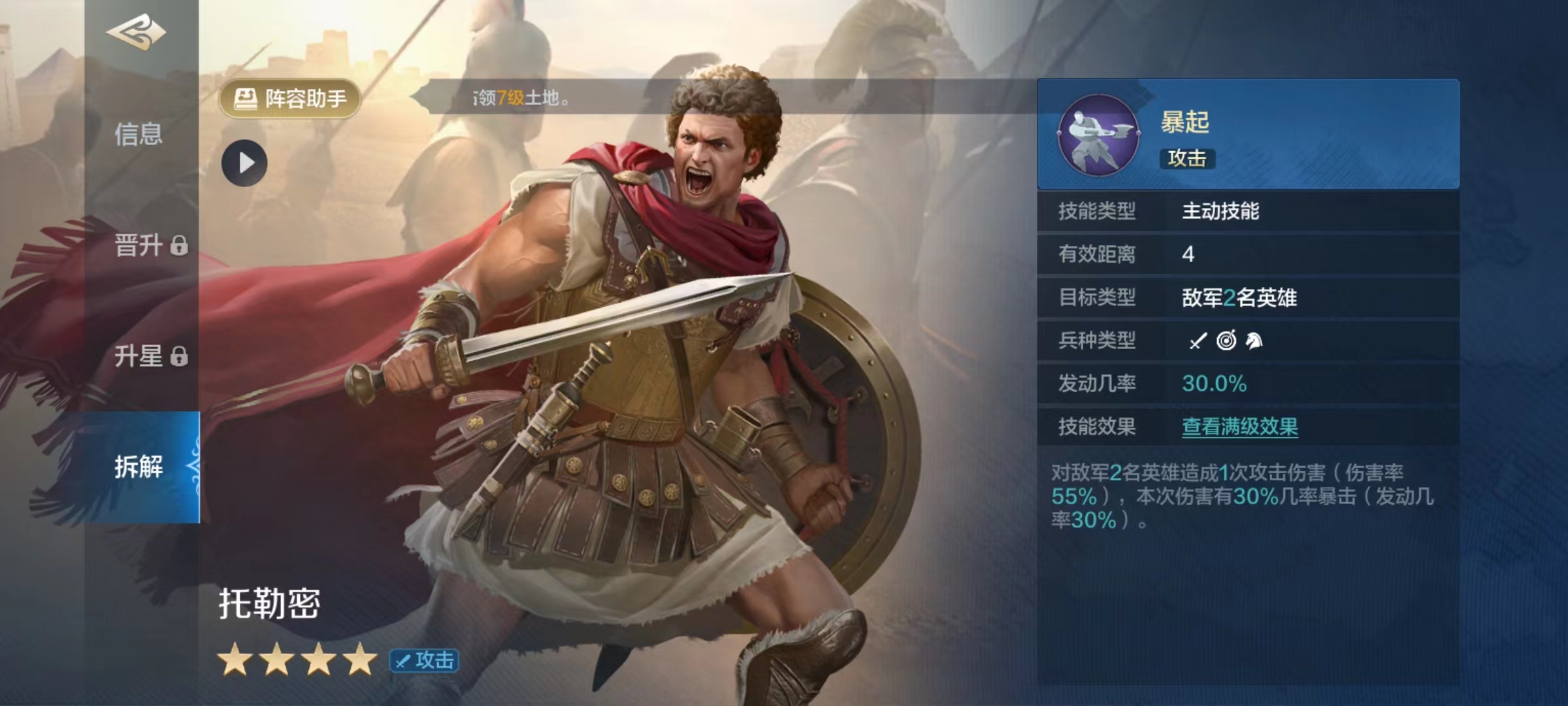 当然全部由四星级武将组成的阵容强度肯定会低一些,但胜在容易成型培养比较简单,这样升星达到高星级后,也可以具有一定的实力。如果大家对这一套流派不感兴趣,托勒密也可以发挥自己的最后作用,那就是被分解掉贡献出一个技能。托勒密所分解出来的是爆起,属于主动技能类型,对敌方两名英雄造成一次攻击伤害,另外本次伤害有30%的几率暴击。