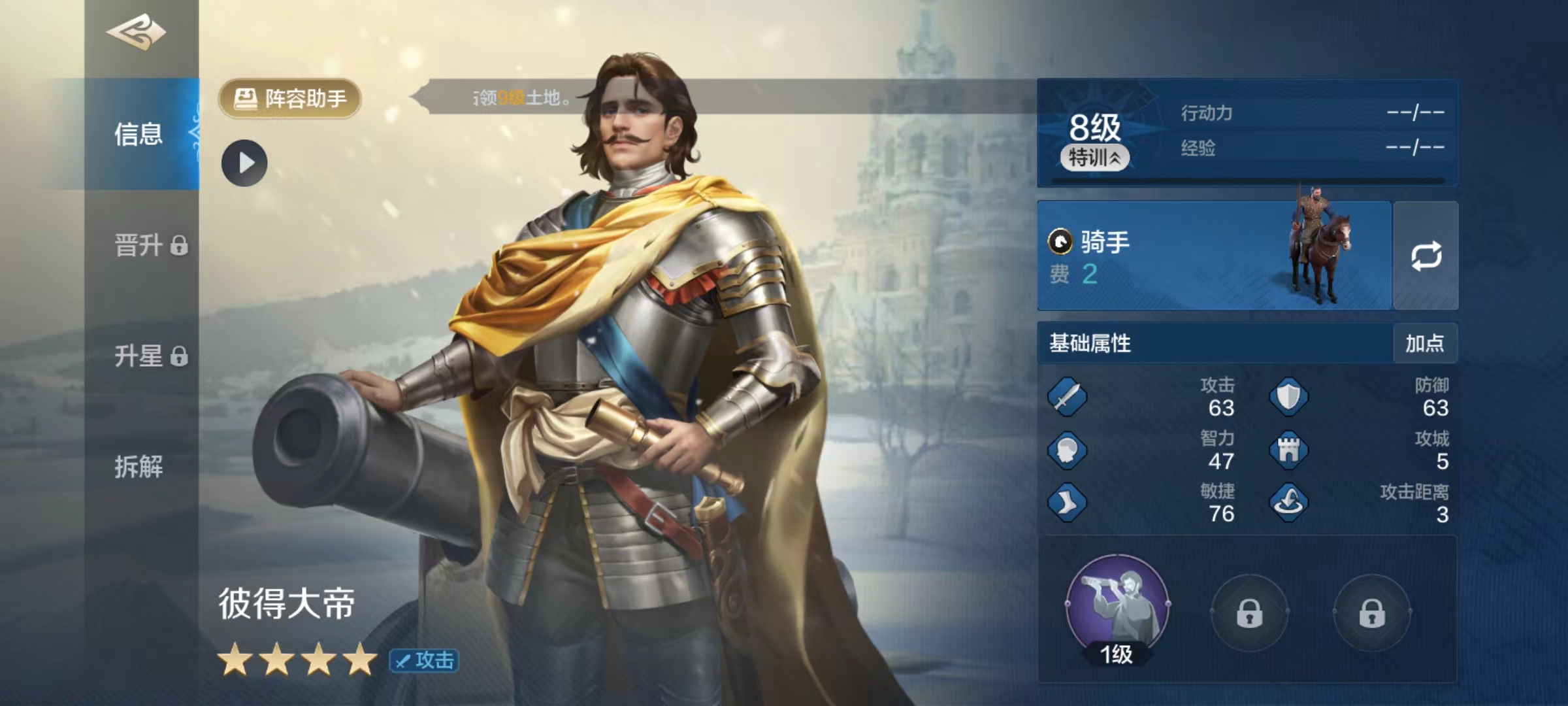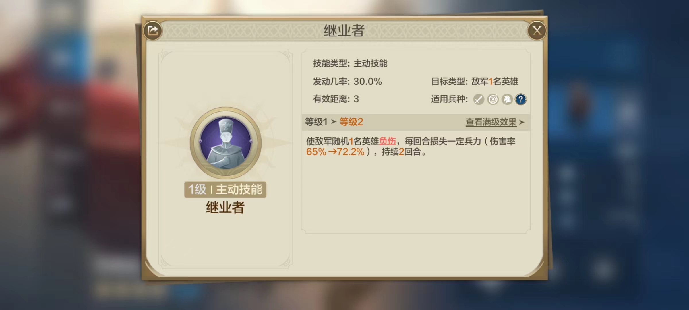 托勒密所自带的主动技能继业者,有30%发动几率,使一名随机敌方英雄受伤,每回合损失一定的兵力,持续两回合。受伤是属于一种减益效果,对方在持续回合内,将在每回合个人行动时都会生效,受到攻击伤害。在四星级武将中,还有一个属于同样的效果,那就是彼得大帝,彼得大帝也比较适合与托勒密一起搭配起来。