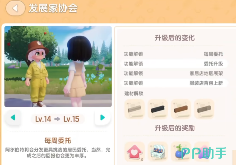 其次是每周的委托任务,不过需要将发展家协会提升至15级之后才会解锁每周委托任务,每周委托任务同样是在地图的右下角去接受任务,每周只需要做一次就可以了,任务的刷新时间在每周六。
